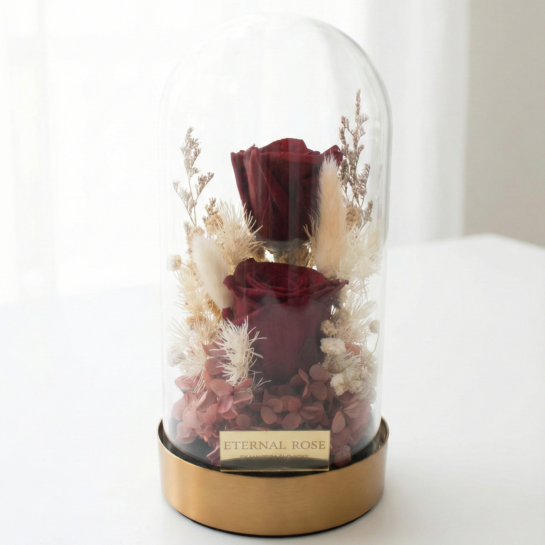Rayakan cinta dan kasih sayang dengan Dome Eternal Roses yang berisi dua mawar merah abadi, melambangkan cinta sejati dan kebersamaan yang tak tergantikan. Mawar merah yang elegan ini menjadi simbol kehangatan dan perasaan mendalam yang bisa bertahan selamanya.