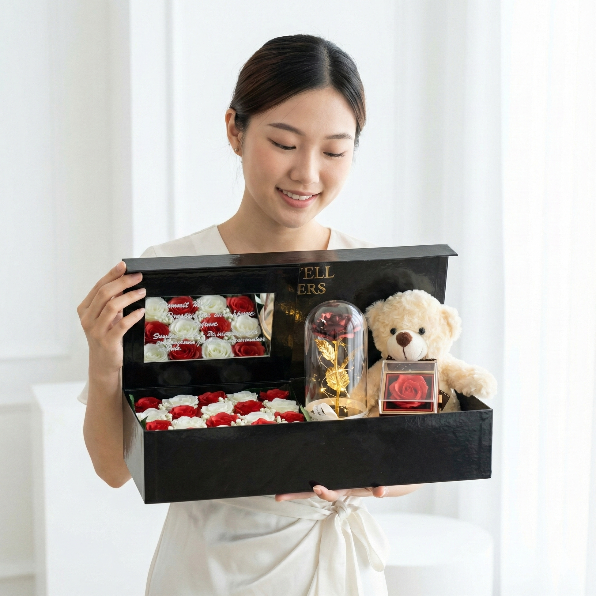 Bunga Cantik Dengan Boneka Teddy Menggemaskan, Rose Dome, dan Rotating Soap Flowers.