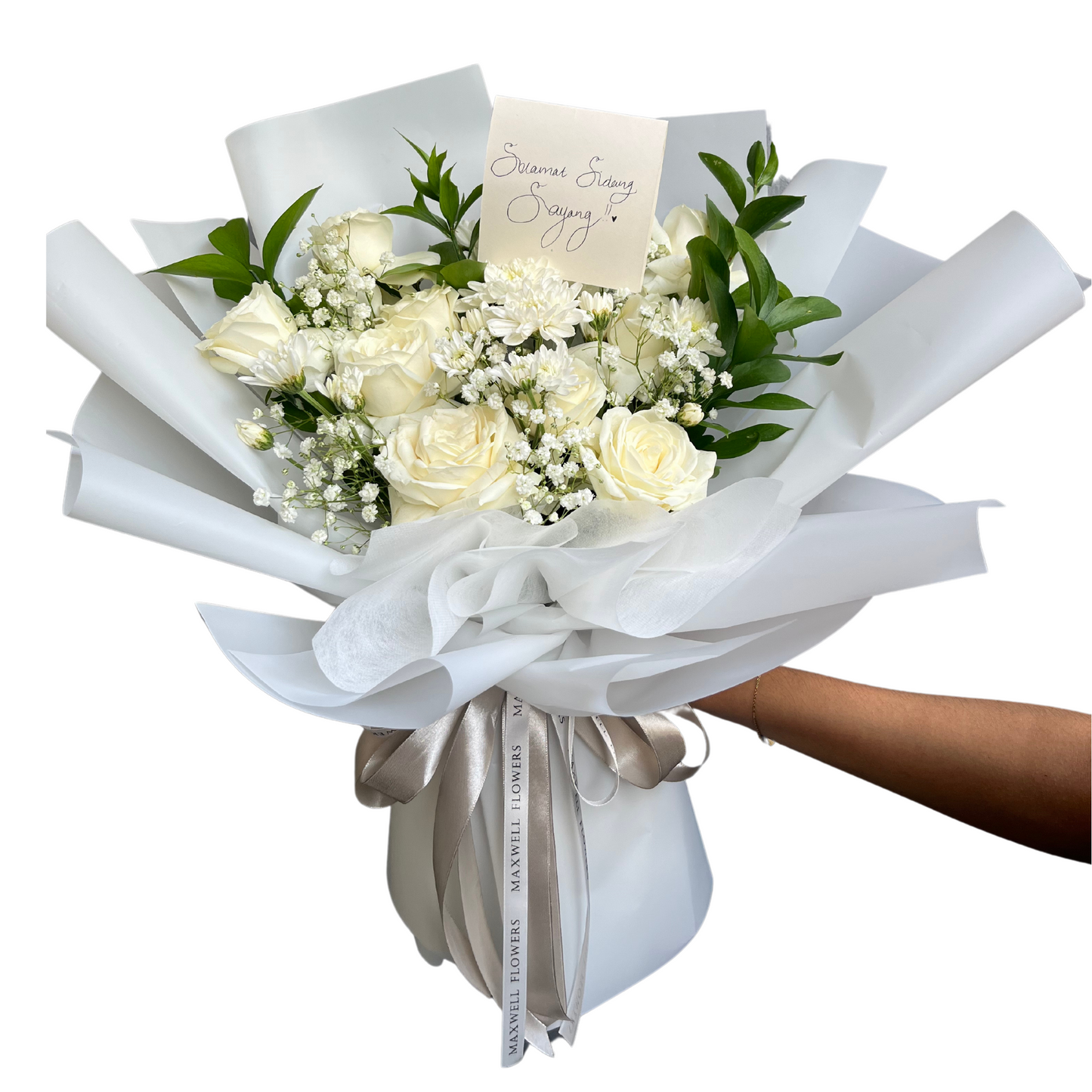 Introducing our elegant 10 White Roses and Aster Bouquet! This timeless arrangement features ten pristine white roses, symbolizing purity and new beginnings, beautifully complemented by delicate aster flowers. Perfect for any occasion, from weddings and anniversaries to birthdays and celebrations, this bouquet exudes grace and sophistication. Handcrafted with care, our White Roses and Aster Bouquet is a stunning way to convey your heartfelt sentiments and make a lasting impression.