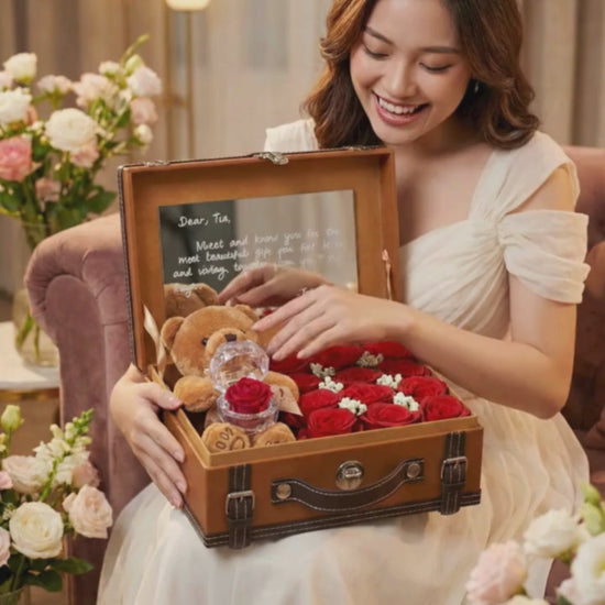 Treasure 12 Roses adalah hadiah bunga premium yang memadukan keindahan, kemewahan, dan makna cinta. Terbuat dari koper kulit imitasi berkualitas tinggi dengan box keras tebal, dilengkapi bunga wangi import yang telah mendapat banyak testimoni konsumen, aromanya tahan lebih dari 2 bulan.